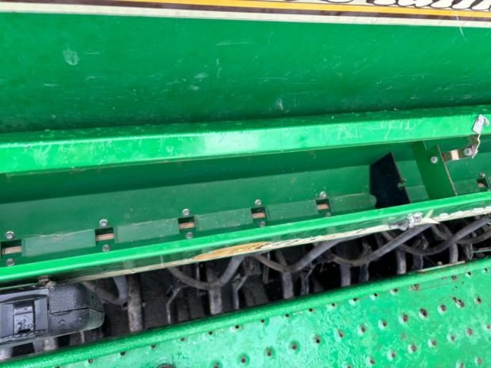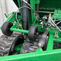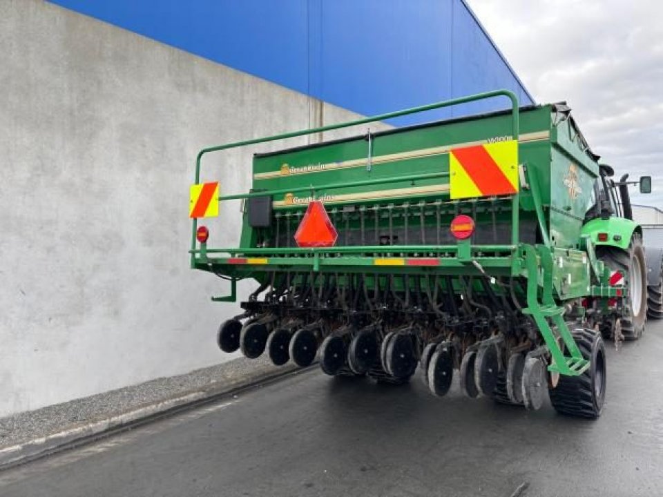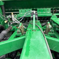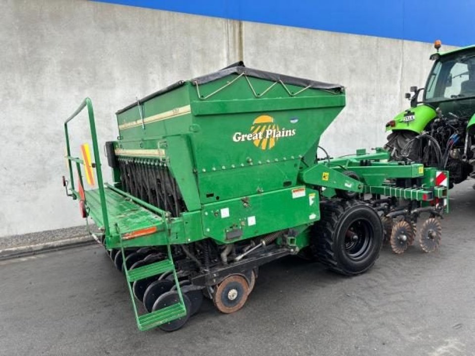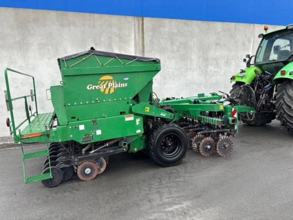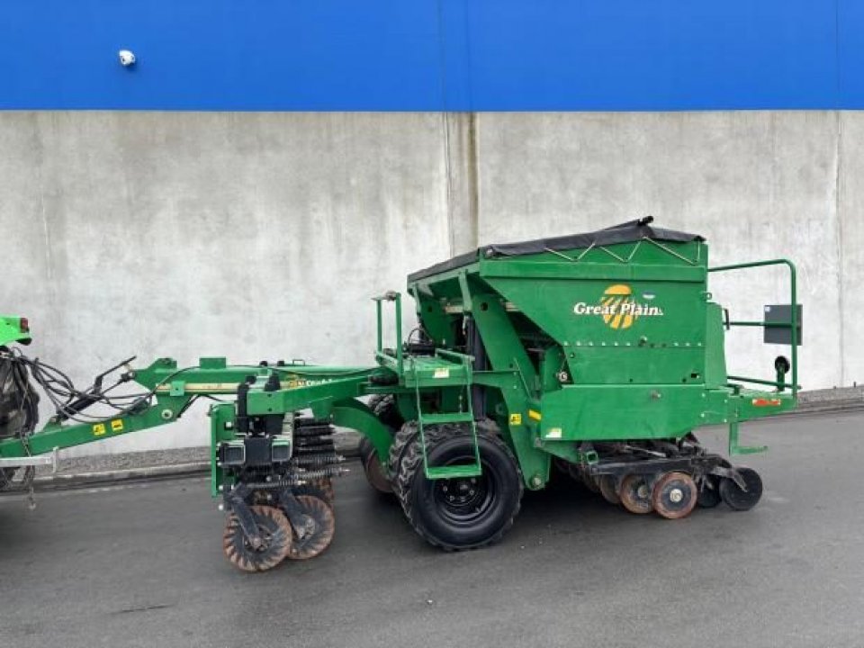 Very tidy one owner Great Plains V300 triple disc drill, large seed/fert bin with adjustable partition, small seeds / insecticide box as well, 6 inch spacing, roller for rolling between carrying wheels for cultivated soil, pivot between opener tool bar and seed bar for towing around corners (lockouts for transport), loading platform, auto downward hydraulic pressure, ready to drill.