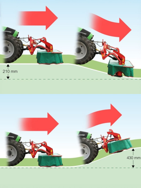 Kverneland 2800 F front mounted disc mowers, with 3.16 – 3.57m working width, is characterized by outstanding ground following ability, easy operation and low weight, leading to excellent cutting performance and ground following ability in all terrain. At standard settings the cutterbar has a remarkable 430mm upwards and 210mm downwards adaptation range, in combination with a transverse pivoting range of 17°. The design does not require a flexible front linkage, as the movement is built into the machine.