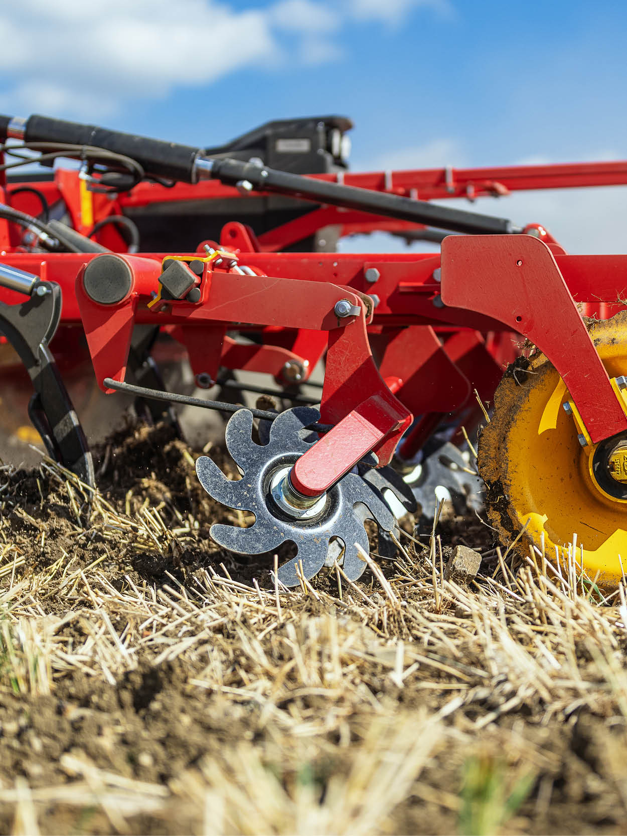 TopDown combines several cultivation stages in one machine, featuring an intensive disc cultivator together with a robust three-axle tine system. Discs spaced at approximately 12.5 cm cut and mix the topsoil to create a fine tilth, while the following tines at around 27 cm spacing loosen and mix soil and crop residues down to working depths of up to 30 cm. In the final stages, a levelling system and packer finish the operation by creating an even, well-reconsolidated seedbed surface.