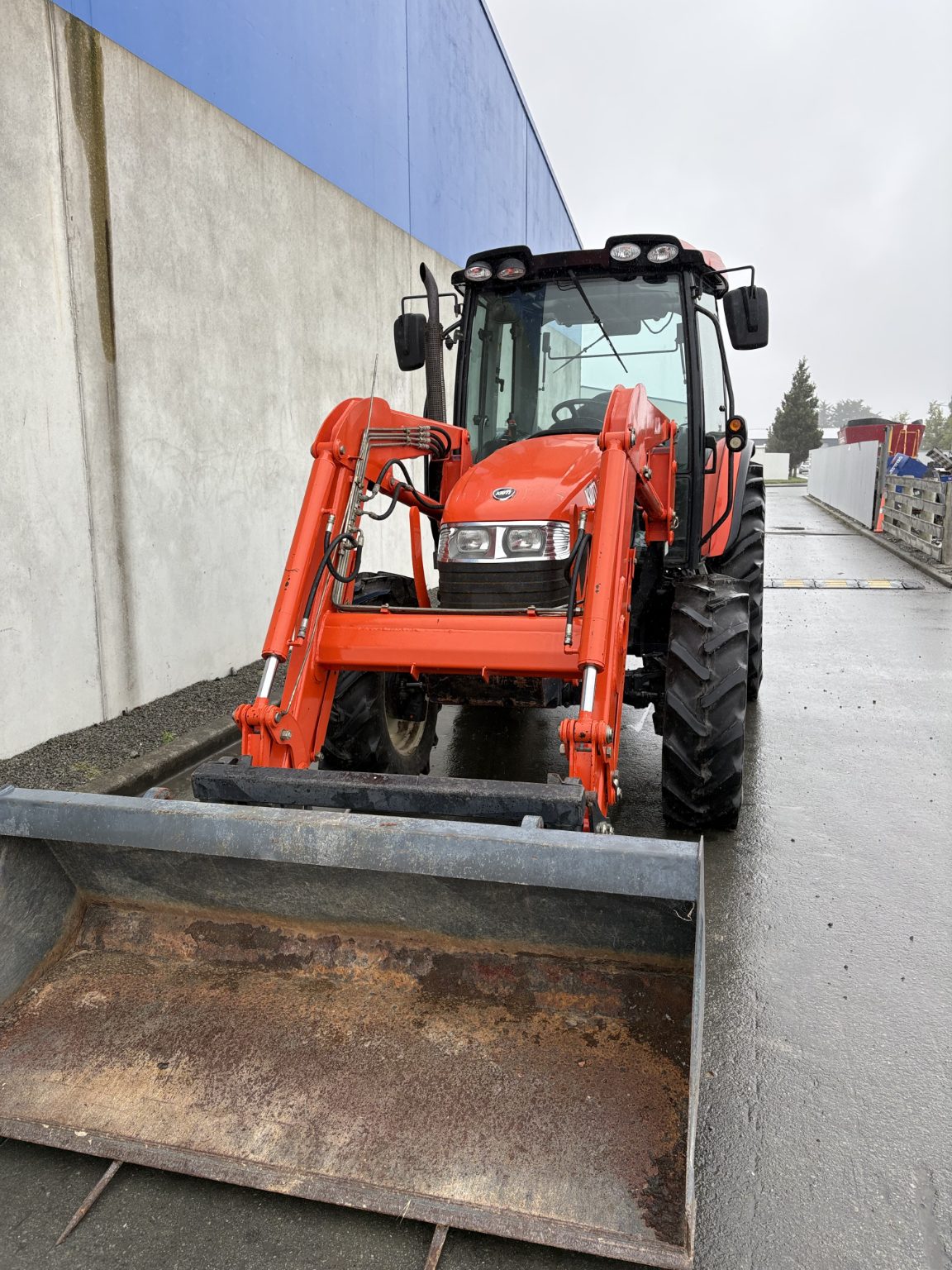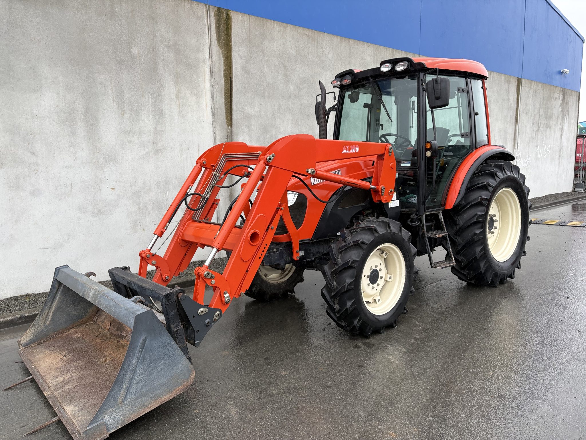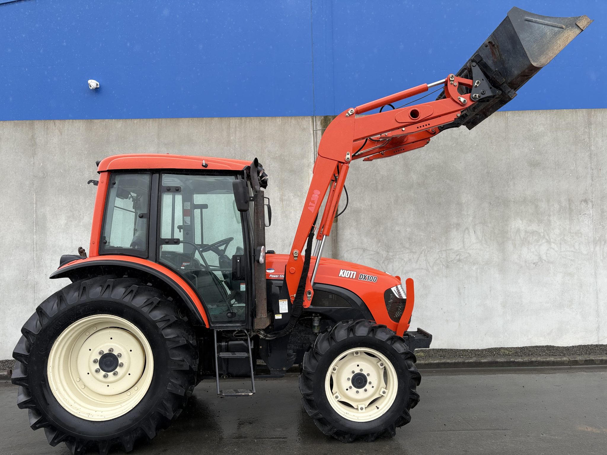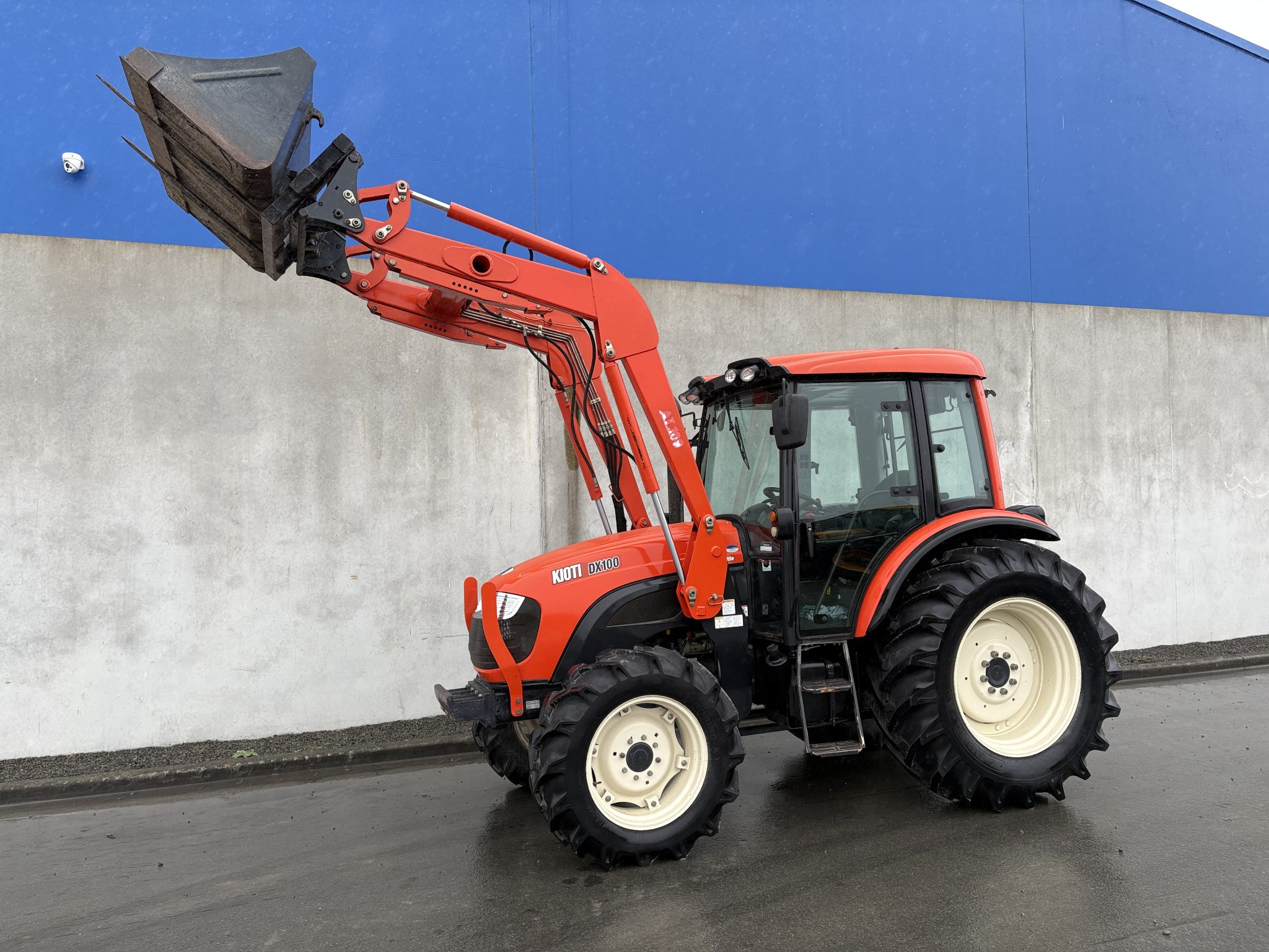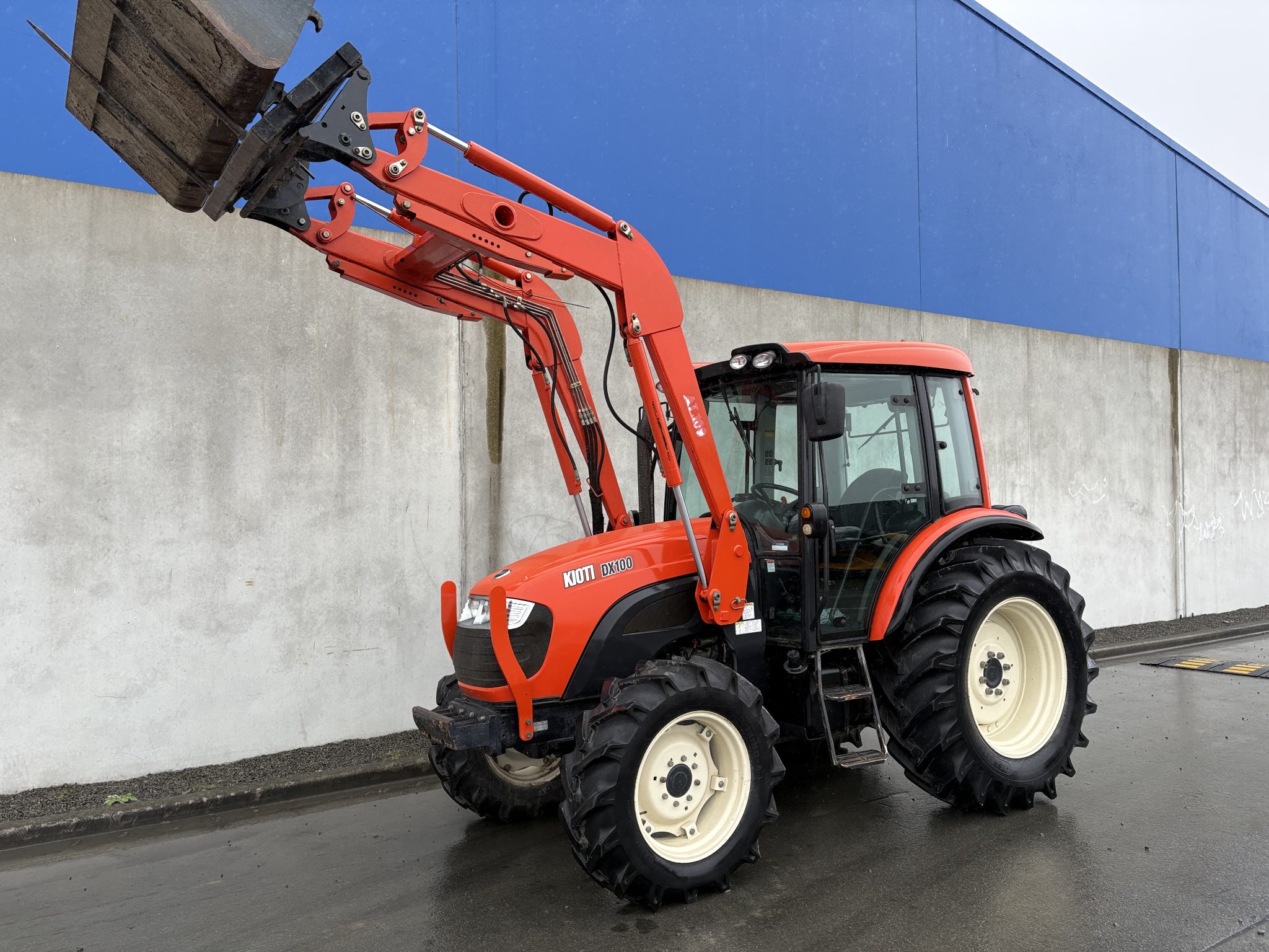 Very tidy 100hp Kioti DX100 and loader with bale forks and bucket on euro hitch, 3rd service, wet clutch with shuttle, air con, good rubber