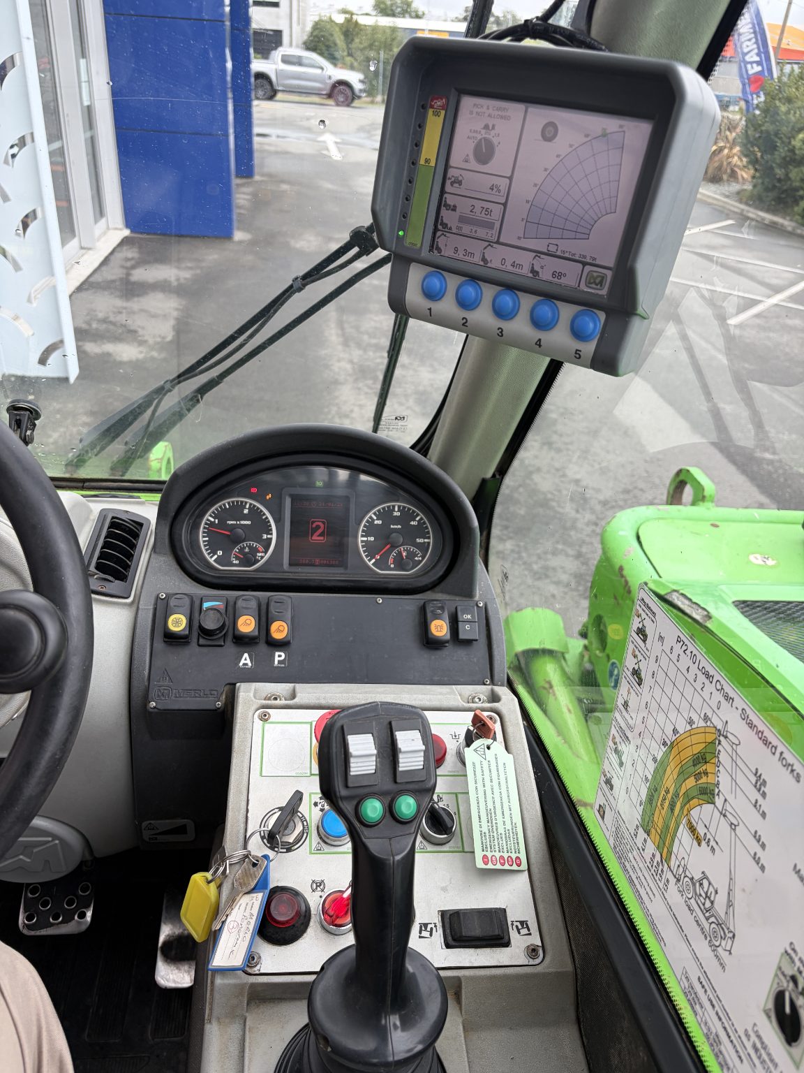 Heavy duty Merlo 72.10 with max lift of 7.2 ton and 10 metre reach. This unit is perfect for construction jobs with the big lift and great reach. It also has frame levelling for working on uneven job sites and side shift on the boom to help with spot on placing.